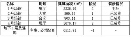标的总用地面积约37亩,容积率0.4,总建筑面积约1.6万平方米(地上总建筑面积0.96万㎡ ,地下建筑面积0.65万㎡),共分为4个场馆,分别为大堂、展示中心、会议中心和餐厅,被户外公共连廊有机的连接起来,创造与城市会展不一样的开放式的休闲度假会展模式,具备首脑经贸会议、庆典、宴会、演出和展览功能。地上停车位50个、大巴停车位6个、地下停车位100个。4个场馆基本情况如下: