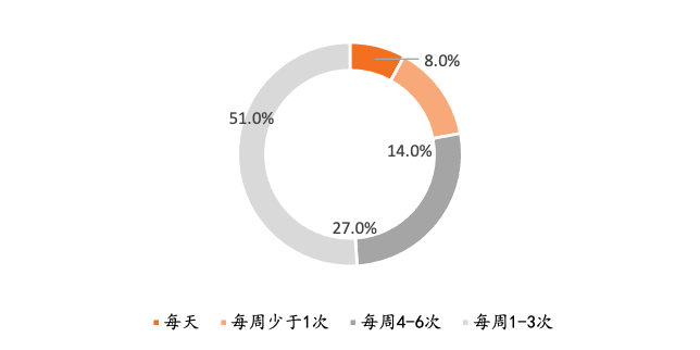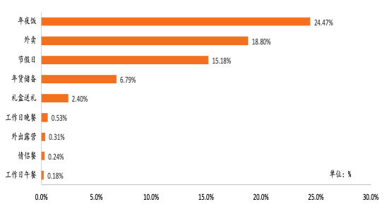 从预加工食品的消费频次来看,大部分消费者选择每周购买1-3次预加工食品,占比为51%,每天购买的消费者占比为8%,由于预加工食品的购买与买菜的逻辑相似,消费者通过会一次性购买几天的饮食量,并不会进行高频次购买。在消费场景的选择上,年夜饭成为预加工食品的第一场景,占比达到24.4%,近年来,盆菜的火爆重新定义了年夜饭,消费者仅需要将盆菜进行加热,就可以吃到由鲍鱼、海参等名贵食材组成的盆菜年夜饭,替代了以往需要花费大量时间准备年夜饭。占比第二、三的消费场景是外卖、节假日食用,占比分别为18.8/15.1%。