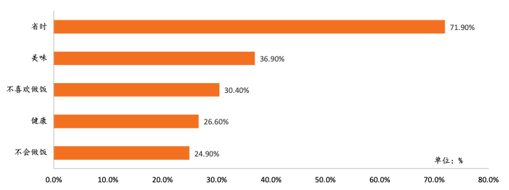 从消费者购买预加工食品的主要目的来看,省时是最主要的原因,有71.9%的消费者因为省时而购买预加工食品,其次是为了美味,占比达到36.9%,由于预加工食品种类丰富,并且已经做好味道的调配,消费者可以根据自己的喜好以及口味选择不同的预加工食品。其余购买预加工食品的因素主要有不喜欢做饭、健康、不会做饭,占比分别为30.4/26.6/24.9%。