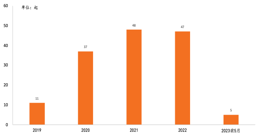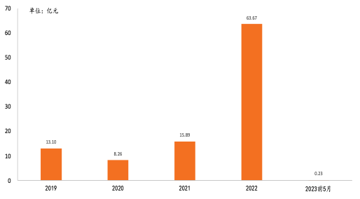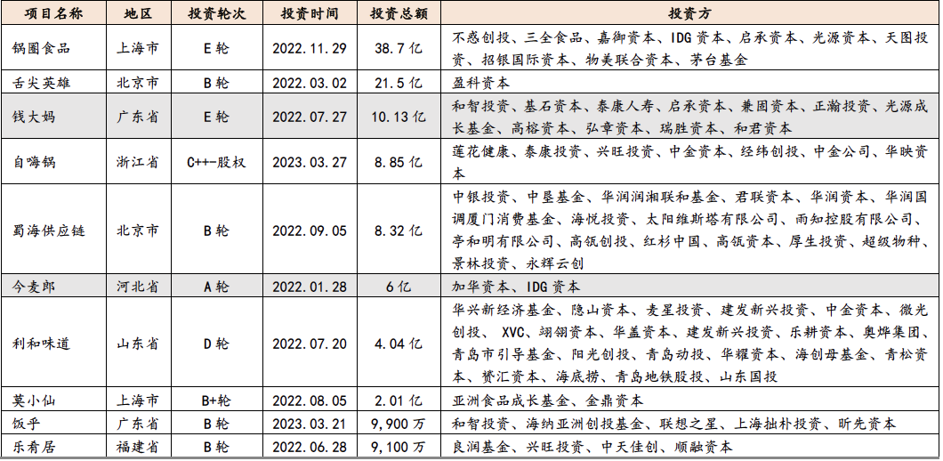 2019-23年前5月中国预加工食品行业融资事件数量分别为11/37/48/47/5起,融资金额分别为13.1/8.26/15.89/63.67/0.23亿元。2021年预加工食品行业融资事件为48起,位列近五年内融资事件数量第一名,从融资总额来看,2022年融资金额最高,达到了63.67亿元。我们认为,由于2020-2022年间,经济下滑阶段,居民正常社会生活及堂食受到一定影响,“宅经济”的背景下推动了预加工食品行业的火爆及一级市场投资人对预加工食品行业的青睐,因此这三年间预加工食品行业的融资事件数量高涨。2022年出现了像舌尖英雄单笔16亿人民币及今麦郎单笔6亿人民币的单笔大额融资,导致全年的融资总额最高。