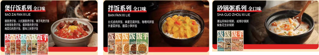 饭乎:饭乎于2020年成立于广东省广州市,是一家专注于提供常温保存的米饭烹饪方案的公司,其产品通过明火、电饭煲或者微波炉加热15分钟即可食用。目前饭乎主要有三大产品线,分别为煲仔饭、砂锅粥及砂锅拌饭;煲仔饭目前有7大SKU,分别为腊肠煲仔饭、腊味三拼煲仔饭、湖南剁椒银鱼仔煲仔饭、湘西烟笋熏肉煲仔饭、辣子鸡煲仔饭、川式腊肠煲仔饭、梅菜扣肉煲仔饭等口味;砂锅拌饭有5大SKU,分别为台式卤肉拌饭、麻婆豆腐拌饭、咖喱鸡拌饭、外婆菜拌饭及酸菜小笋拌饭;砂锅粥系列有3大SKU,分别为潮汕风味、咸骨砂锅粥及柴鱼花生砂锅粥。