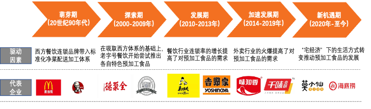 中国预加工食品行业的发展历程主要可以分为5个阶段,西方餐饮连锁巨头进入中国市场之后,其净菜配送加工工厂的标准体系让中国餐饮行业首次了解预加工食品,到2000年前后,国内一些老字号连锁企业开始在净菜的基础上对禽肉和水产等原材料进行加工,但由于技术及区域的现制,预加工食品的发展程度较低。紧接着,在2010年前后,伴随着餐饮行业连锁化的进展加快,企业对成本及出餐标准化有了进一步需求,推动了预加工食品在B端的需求。另一方面,社会节奏的加快及消费习惯的变化推动了预加工食品在C端的需求,预加工食品迎来了加速发展期。