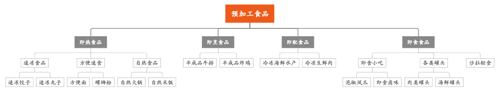 预加工食品通过其加工程度,主要可以分为四大类,分别是即食类、即热类、即烹类及即配类。即食类是指开封即可食用的预制调理制品,例如各种即食小吃、罐头等等;即热类是指经过加热即可食用的食品,例如各种自热产品、速冻产品等等;