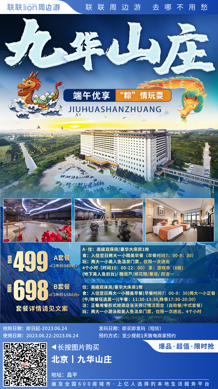 【九华山庄-国际会展中心酒店】限时499元享“粽”情玩耍套票,698元享“粽”夏时光套票!吃喝玩乐一站尽享~