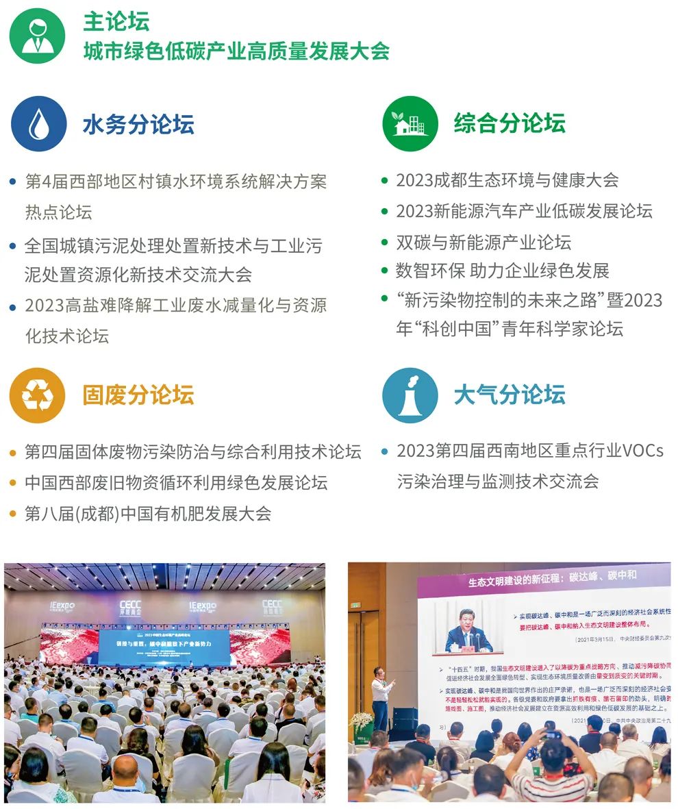 “第四届中国环博会成都展” 受疫情影响延期至2023年举办,参展商和广大环保行业同仁热忱期待展会重启,以提供专业、优质的展示和交流平台,促进产业链上下游对接,激活沉寂了一年的西南地区环保市场。本届展会将紧抓新一轮发展趋势,继续扩大品牌及资源优势,在原有水、固废、大气、土壤、监测、综合治理六大展示板块的基础上,融合西部环保行业特色与发展趋势,设立成都生态环保重点企业集中展示区、新能源企业展区、绿色低碳主题展区,以产品设备展示和典型应用场景演示等生动的方式,展示减污降碳与新能源开发利用协同发展的优秀成果。同期举办“1+N”场行业高端论坛,以“专业展览+行业峰会”联动模式,汇聚减排降碳先进技术的绿色低碳企业与行业专家,展示分享最新成果和应用案例,共享知识、融合共赢,拓展更多更广泛的合作机会。