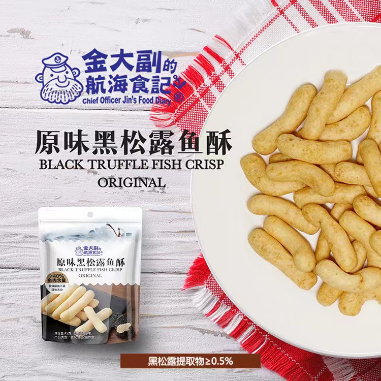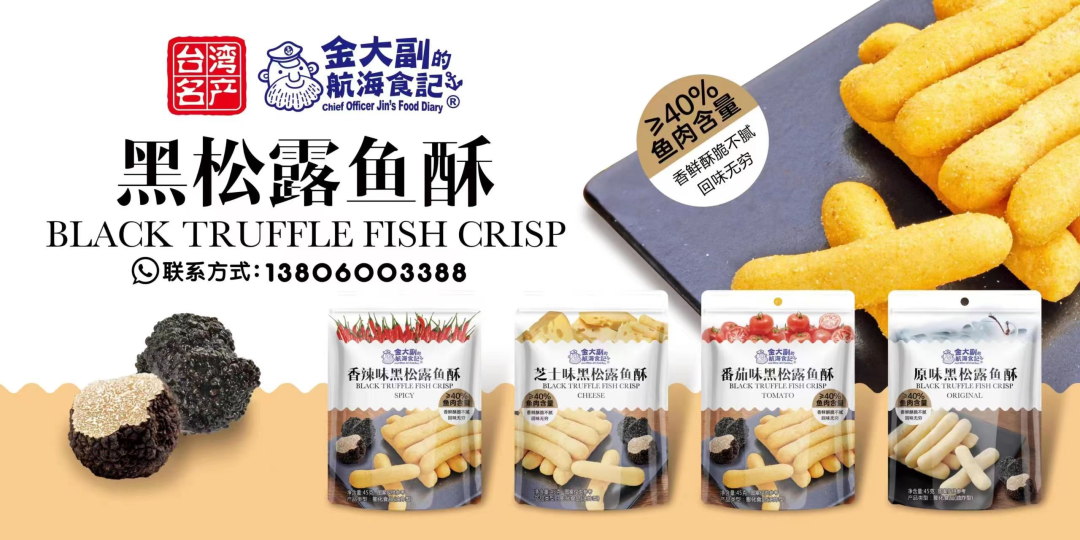 公司介绍:台湾名产, 台湾嵩程食品有限公司监制,大陆嵩程食品有限公司生产(台湾独资企业),专业生产台湾名产《鱼酥》,该产品的生产工艺采用低温制作,原料选用进口变性淀粉和鲜鱼肉及添加黑松露提取物制作,鲜鱼肉含量≥40%,无添加香精,色素和防腐剂。口感酥脆,鱼香浓郁的休闲食品。产品包装袋条形码为台湾条形码。