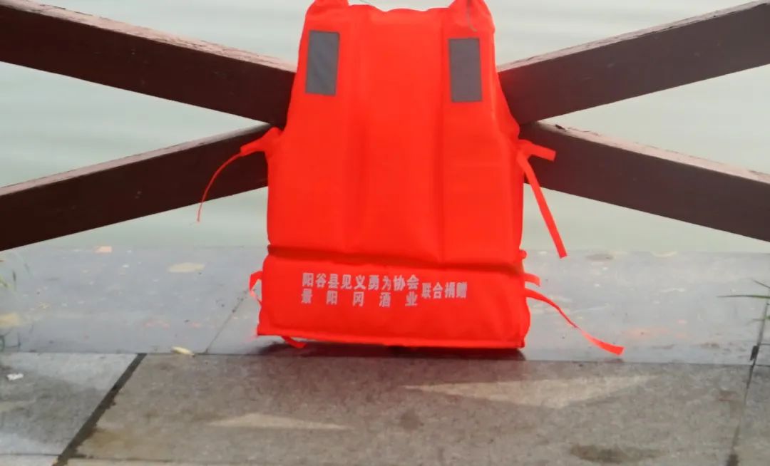 由阳谷县见义勇为协会和景阳冈酒业联合捐赠的100件救生衣也同时悬挂县城各重点防溺水区域,为防溺水工作保驾护航。