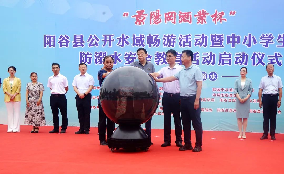 聊城市见义勇为基金会理事长、聊城市政法系统关工委常务副主任付强,聊城市委政法委机关党总支专职副书记赵振华,阳谷县关工委常务副主任秦广胜,阳谷县政协副主席、关工委副主任王泽文共同按动启动球,“景阳冈酒业杯”阳谷县公开水域畅游活动暨中小学生暑期防溺水安全教育活动正式启动。