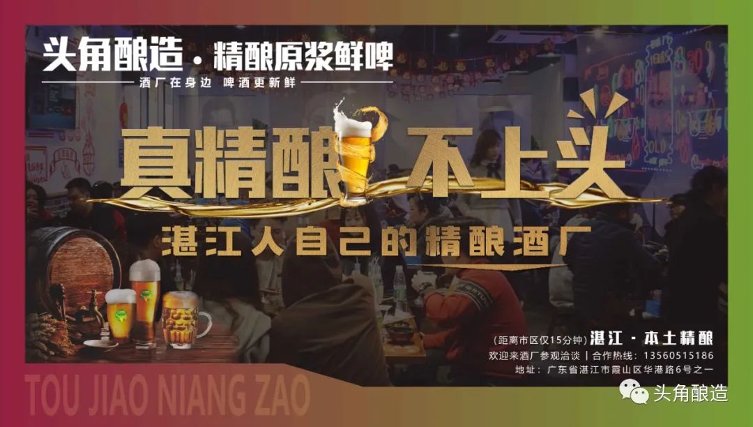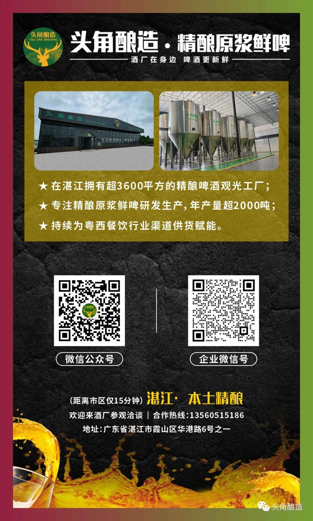 湛江市头角酿造最早成立于2019年,原名《托克精酿》。后经4年的市场经营成立了本土品牌《头角酿造》。通过产业链资源,与不同地域不同规模的优质原材料厂家建立了合作关系,保证产品质量和供货稳定。酒厂专注于精酿啤酒的研发,转化,品牌打造和为客户提供专业且优质的酒水,设备,培训,销售等服务。通过与客户的紧密合作,产品的品牌推广打造以酒厂越近越新鲜,喝少点喝好点,绿色健康的本土精酿品牌。