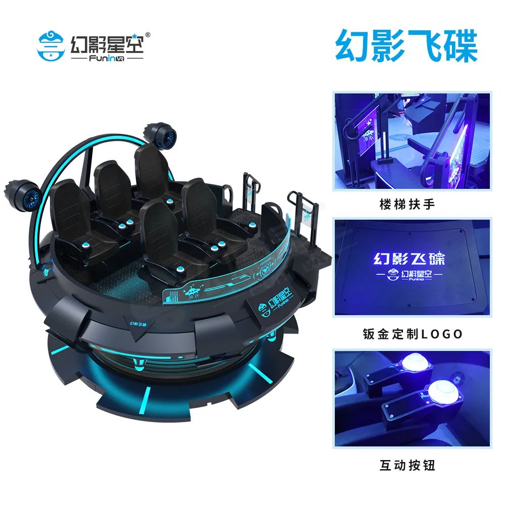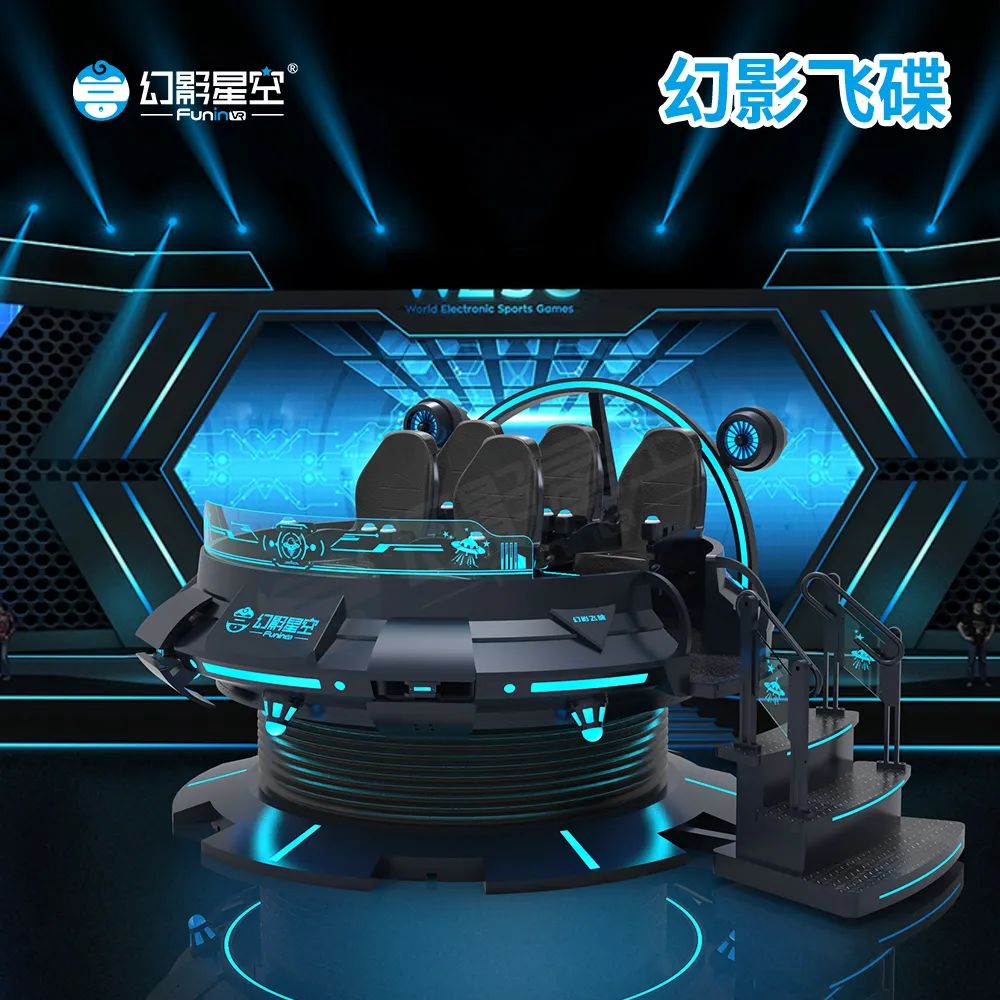 幻影飞碟:人气明星VR产品,吸睛亮眼百分百!炫酷科幻飞碟造型,暗黑风格搭配蓝光渲染,科技感爆棚,一次可5人同时体验!采用前沿专利曲柄技术+360°全方位回旋结构技术,模拟更多角度及姿态。配合互动射击+多种特效,超强沉浸体验!尖叫声不断!