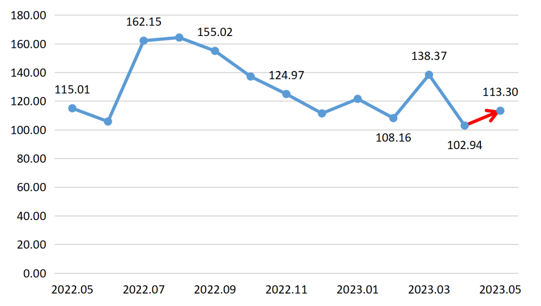2023年5月,进口原酒价格指数触底反弹,指数升至113.30点,环比上涨10.06%,同比小幅下跌1.49%。