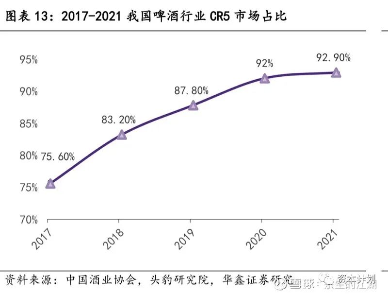 非常巧合的是,青岛啤酒在2013年底和当下的PE都是33.5,因此如果在2013年底不幸以49元的高价买入,那么回报率等于净利润增速7.6%加上1%多一点的股息率,约9%。当然,你得忍受两年后由于净利润腰斩带来的股价腰斩,不过如果你刚好在这个节点逆向买入,回报大约7年4倍。为什么下滑如此明显的行业还能有不错的回报呢?不少信息指向行业集中度提升和产品结构高端化转型。先看集中度提升方面,下图出自华鑫证券研报的一张图引用的比较广泛,大体上是说头部的5家企业的集中度由2017年的75%提升到2021年的93%。