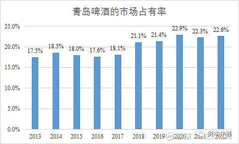 上图是2018年重啤的产能情况,可以看到实际产能和设计产能的GAP。另外,从下图中青岛啤酒的市场占有率看,在最困难的2016年以前,青啤的市场占有率也只有不到18%的水平,突然在2018年就提高到21%以上,而刚好2018年就是统计口径调整的年份。