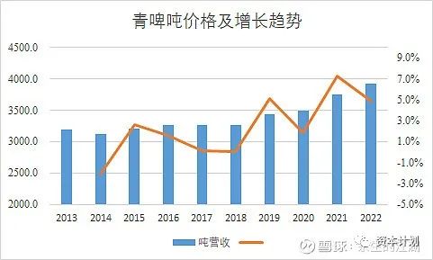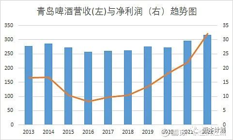 上图是最近10年啤酒行业产量的变化趋势图,从中可以看出在2013年产量达到最高点之后持续下滑,一直到2021年才开始稳定,产量从接近5000万千升下滑到只有不到3600万千升。如果不告诉你这是啤酒行业的产量数据,或许不少朋友会直接将这个行业判断为夕阳产业,毫无投资价值。其实,尽管行业产量下滑,但头部企业的盈利水平相对于10年前是不错的。以青岛啤酒为例,2013年至今营业收入的复合增长率1.4%,而扣非净利润增速7.6%。