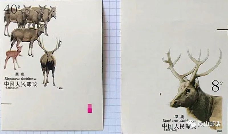 第五套是1988年12月20日发行《麋鹿》特种邮票(无齿)影写版一套2枚。在笔者的家乡江苏省盐城市广袤的滩涂湿地上,建有世界最大的麋鹿自然保护区——大丰麋鹿国家级自然保护区。34年前,我作为地方政府的代表,有幸参加了《麇鹿》邮票首发式,并获赠两套《麇鹿》邮票(其中无齿1套)。《麇鹿》特种邮票画面设计淡雅清秀,兼有稳重之感,麋鹿采用其本色即淡褐色,极好地衬托出主图,自然贴切,更加表现出麋鹿的灵气。其中第一枚图案为雄鹿头部特写,画面细腻逼真;第二枚图案为麇鹿群图,画面通过雄、雌、幼鹿的各种形象展示麋鹿的风姿。