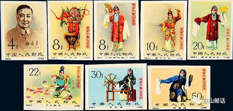 首套无齿邮票(套票),是1962年9月1日发行的《梅兰芳舞台艺术》纪念邮票(无齿)影写版一套8枚。该套邮票设计形象特别,图案采用了梅兰芳京剧艺术照,方寸之间将梅兰芳两只水袖抖拂展现得大方自如,既表现了杨贵妃的雍容华贵,连长吁短叹、自怨自艾在水袖上流露无遗,又展示出其高超的技艺,梅兰芳的精湛表演艺术和邮票传神的设计,加之发行量及整套邮票的存世量甚少,显得十分珍贵。