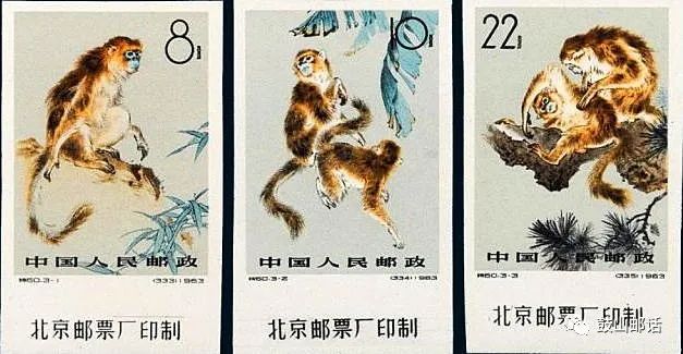 第四套是1963年9月25日发行的《金丝猴》特种邮票(无齿)影写版一套3枚。该套邮票由中国著名画家刘继卤创作。邮票画面上金丝猴的头部和背部的色彩同红狐一样,四肢和尾部都是淡灰色,胸部是白色,有一双圆而黑的眼睛。脸是蓝色,鼻子上翻,背部两侧有两组淡黄色的长毛。