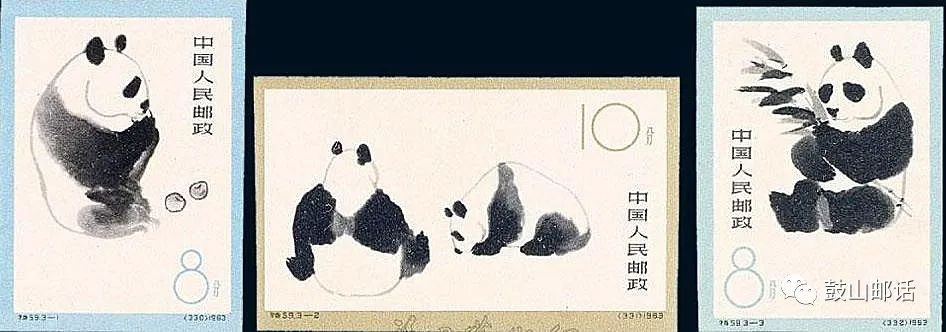 第三套是1963年8月5日发行的《熊猫》特种邮票(无齿)影写版一套3枚。该套邮票图案由中国著名画家吴作人绘制。四只熊猫姿态各异,画面突出熊猫的头部,特别是耳朵和两脚,寥寥数笔将熊猫画得十分逼真、可爱。