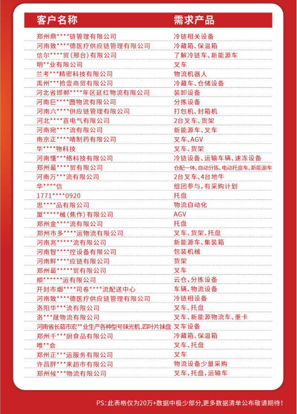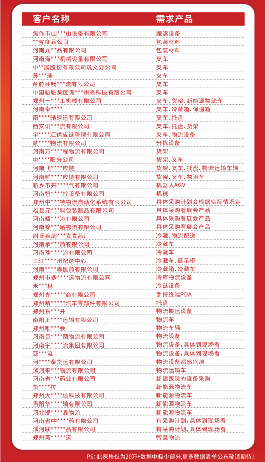 大量参与用户行业会议活动,面对面与企业对接需求;联合多省市行业协会共同组织买家、投放百度广告精准数据覆盖、行业媒体大力宣传等手段扩大买家企业覆盖范围,已触达22个大中部优势细分行业,预计将有上百家组团企业到场参观,截至目前,万邦物流、中国石油、四通集团、精诚工科、厦工机械、多米诚运、兆祥物流、平原光电、开封市烟草、博世通物流、正大物流、金象物流、华晟物流、千味央厨、米村餐饮、精益达汽车、河南泰丰、恒源医药、爱森医药、贰仟家物流、泰浦物流、前程物流、大河智信、航投物流、百威啤酒、乾龙物流、华元嘉信、飞腾供应链、冰轮冷链、华驰供应链、郑州交运、最慧科贸、河南懂菜、华畜生物、顺瑞物流、明镁镁业、巨洋方圆等500余家知名企业已预登记参观,第一、二期采购需求也新鲜出炉。