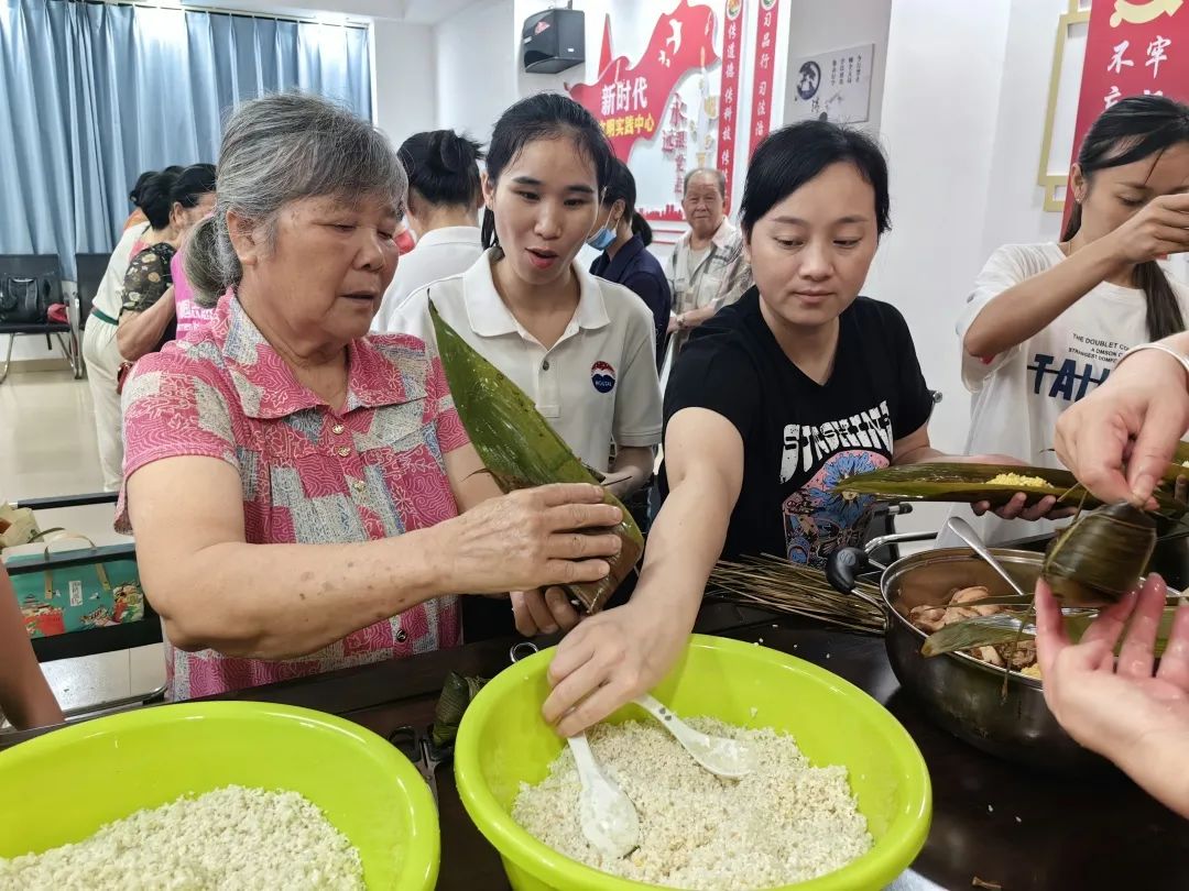 包粽子是大家最期待的环节。桌面上一盆盆调制好的糯米、蜜枣、瘦肉馅料,一捆捆的粽叶,一把把的棉绳,在大家灵巧的手中变成了让人喜爱的粽子。老人们都是包粽子的好手,手把手地进行指导,过程中大家聊起家常,工作人员询问了老人们的日常生活及健康情况,一个个粽子承载着彼此之间的关怀和情感。