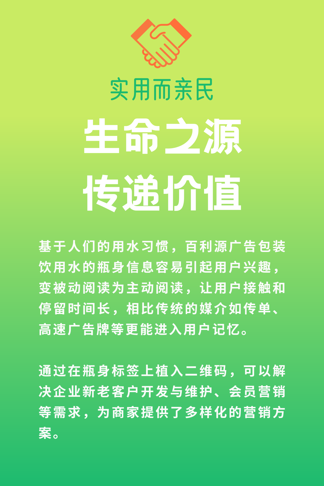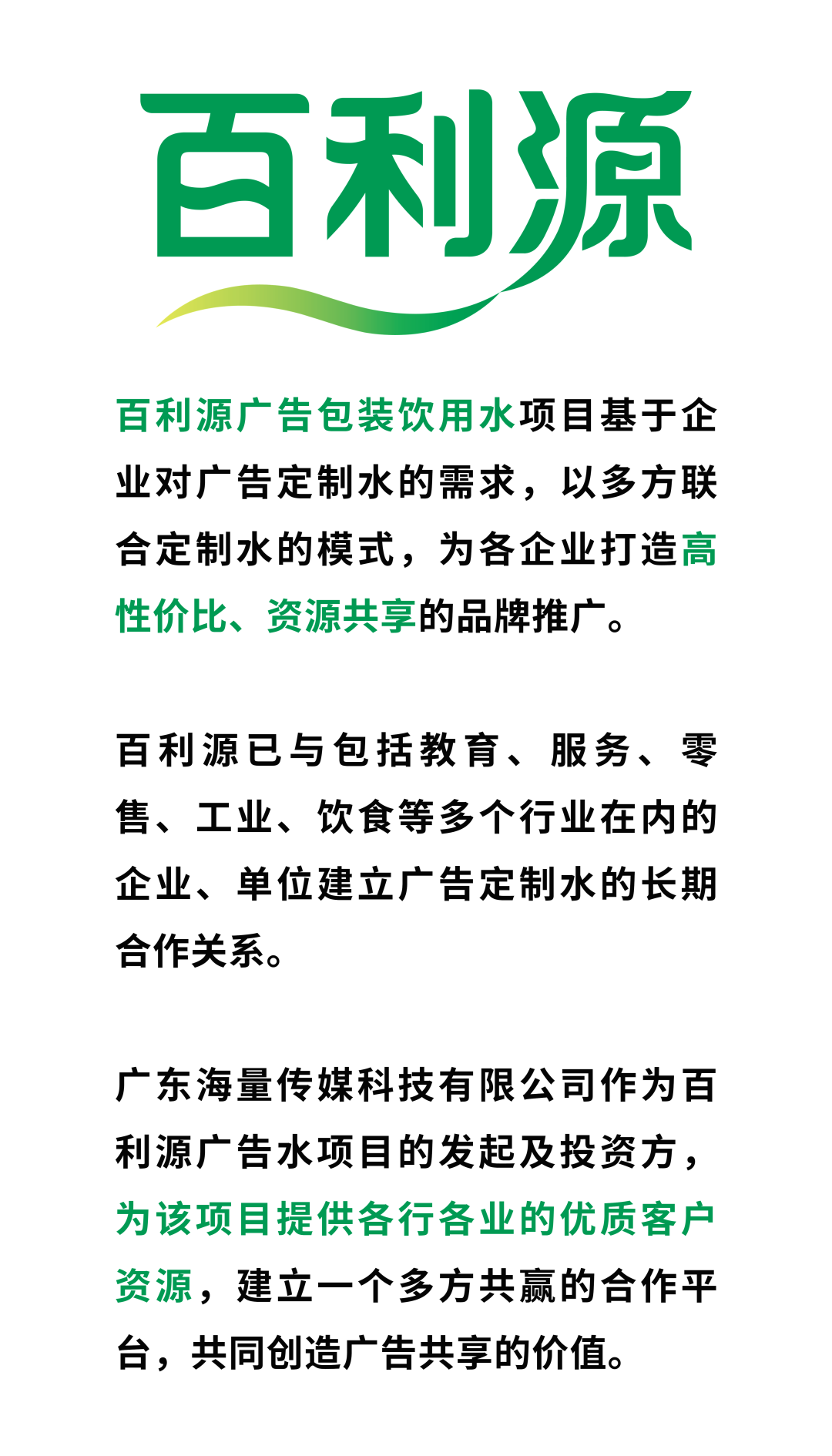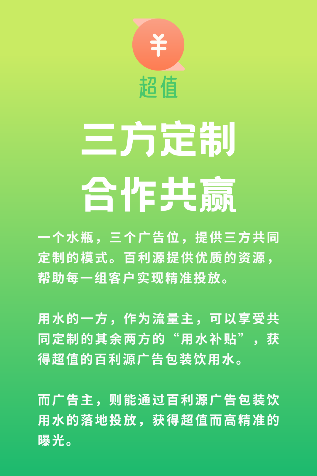 用水的一方,可以享受共同定制的其余两方的“用水补贴”,获得超值的百利源广告包装饮用水。还能通过其余双方的落地投放,借助合作方的会员或老客户群体,实现口碑的倍式传播和客户/会员的真实增长。