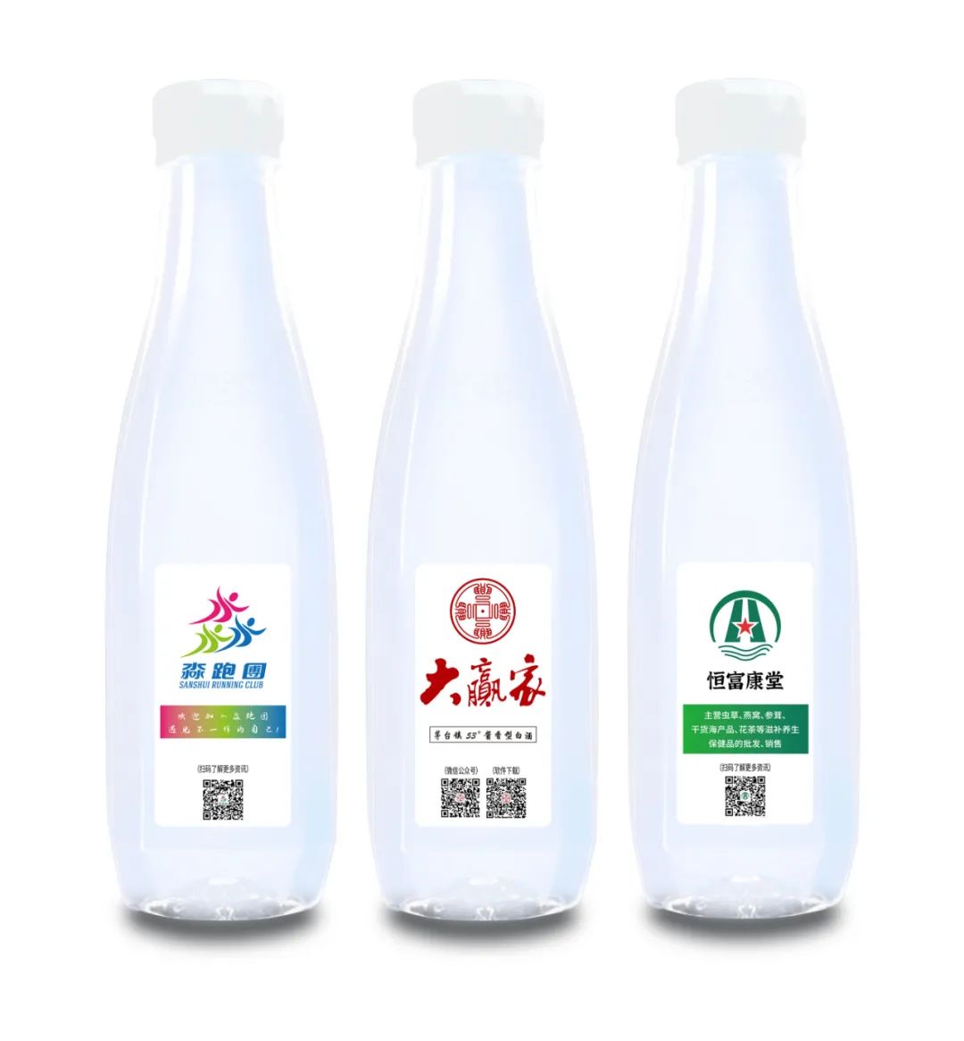 百利源为大赢家酒业、恒富康堂、淼跑团三家企业/单位,提供三方共同定制的模式,年生产30000瓶广告水,帮助三方实现精准投放。