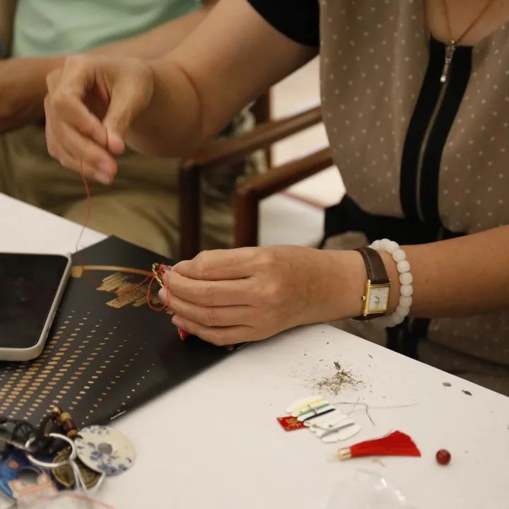 多种中药被依次填入香囊之中,清幽的香气在室内弥漫开来沁人心脾。大家将自己制作的香囊挂在家中,或随身携带,有避邪驱瘟之意,襟头点缀之风。