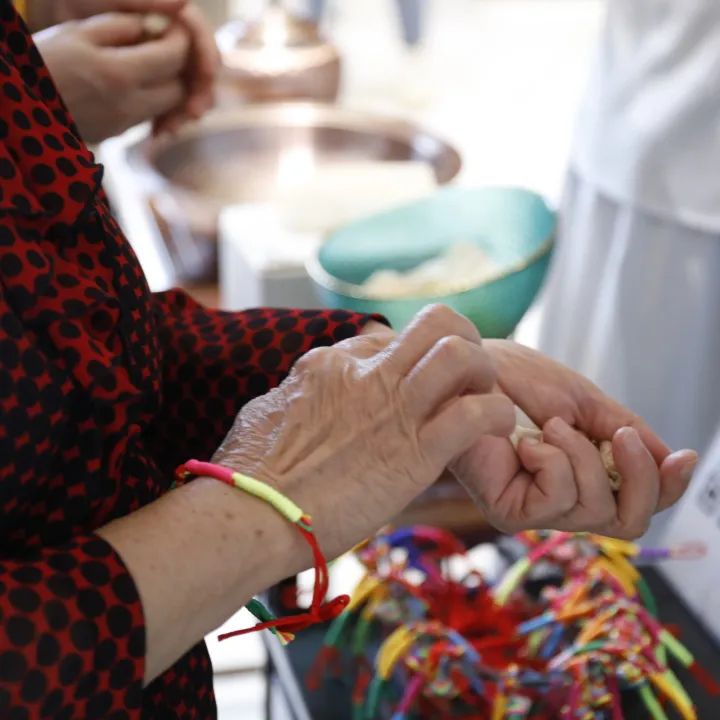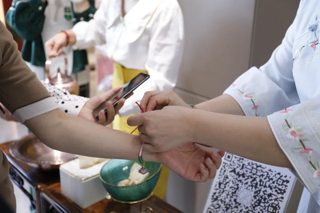 我们准备了各种中草药煮成的“药水”,为各位嘉宾用来洗手,再佩戴上代表金木水火土五种颜色的五彩线手绳,最后将泡过雄黄的五粮液涂抹在耳后,寓意祈福辟邪,幸福安康。