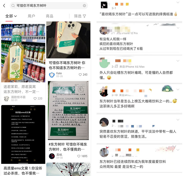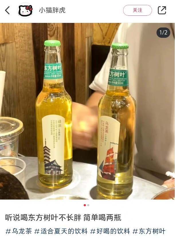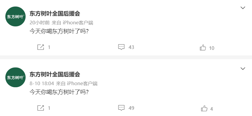 相信看到这里大家一定跟圈佬一样感叹,东方树叶碰上这两次的用户UGC,真的是蛮幸运的。不过说到底,如果非要盘一盘东方树叶自身的魔力,那圈佬觉得大致可以从两点说起——东方树叶是2011年由农夫山泉推出的首款无糖饮料。比较有趣的是,在2016年网友票选“中国最难喝的五款饮料”的评选中,东方树叶名列前茅。但实际上大家的口味是有差异的,有人觉得难喝也有人觉得不难喝。甚至于“喝不喝东方树叶”也一度被拿去作为个人的一个标签:还有爱的深的用户自发成为东方树叶的野生后援会,为其做宣传:而这样的独树一帜的标签寓意,也让东方树叶这个品牌拥有了别的品牌说没有的话题敏感和社交属性。不仅让大家更清晰了产品无糖的健康认知,也能使品牌更容易在网友之间生出故事。另一方面,由于近几年大众对低糖健康的关注和要求也越来越高,无糖无添加的概念在市场上打得火热。