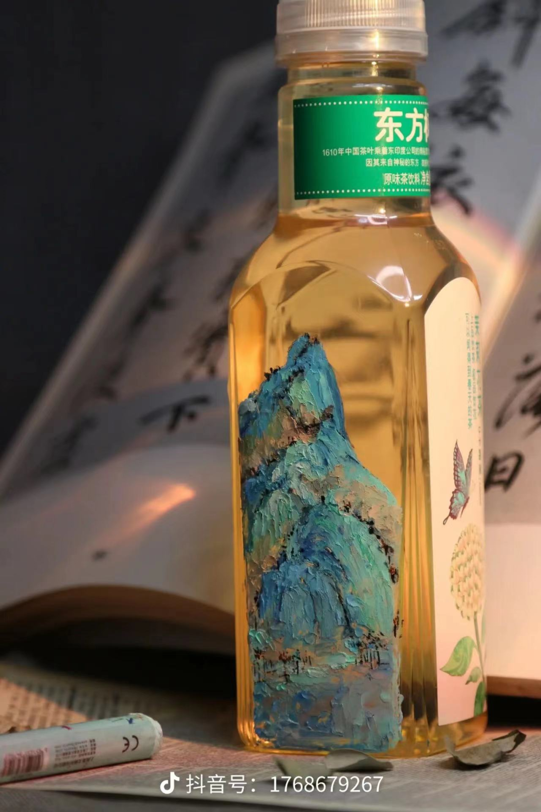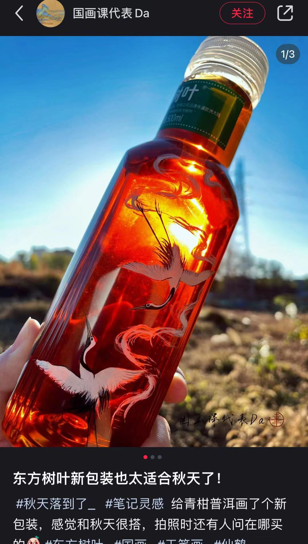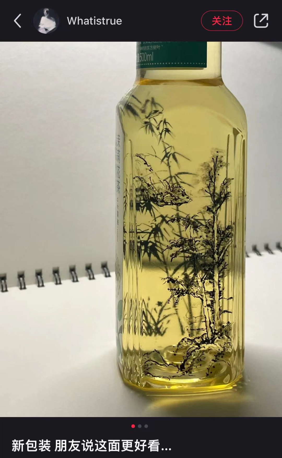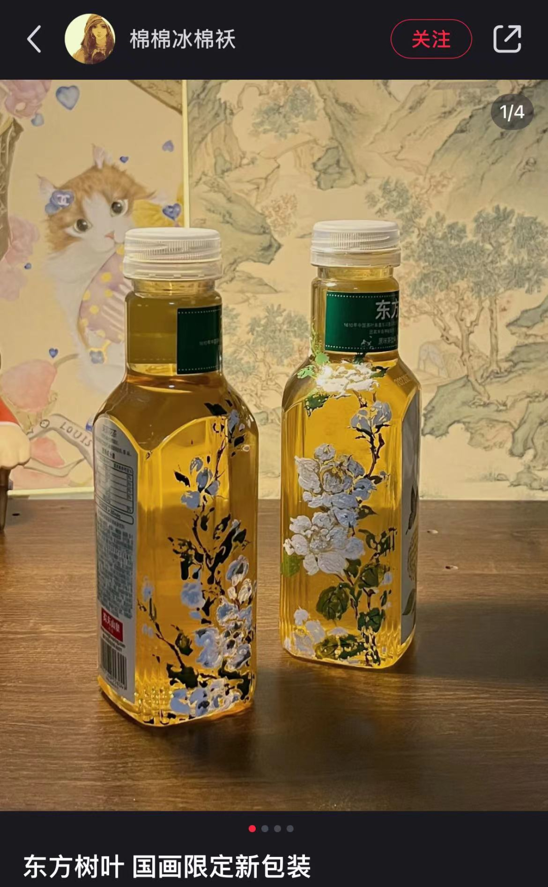 当时是因为东方树叶的茶色有一种做旧感,很像作画的发黄的宣纸。同时品牌自己也主打一个中国风的气质。于是网友也以此为创意点,就开始在瓶身自发创作。不仅写了许多铿锵有力的书法,还画了很多国风气质的画。……