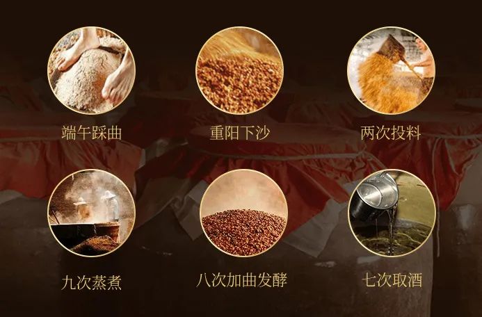 端午制曲,重阳投料,九次蒸煮,八次发酵,七次取酒,高温制曲,高温取酒,长期窖藏