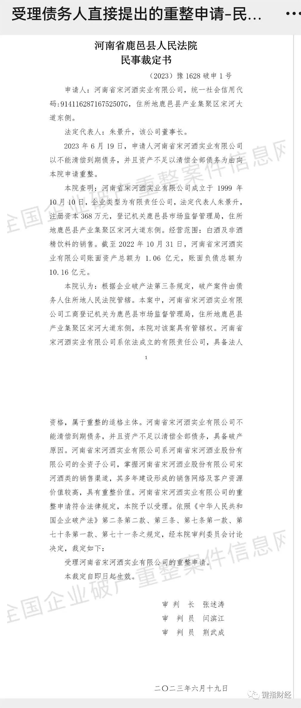 前一阶段,宋河酒业搞了预重整。确如鹿邑法院《民事裁定书》所说,“存在有多家潜在的重整意向投资人”,业界对宋河酒业的投资运营价值、对其发展前景,持乐观态度的人还是大有所在。