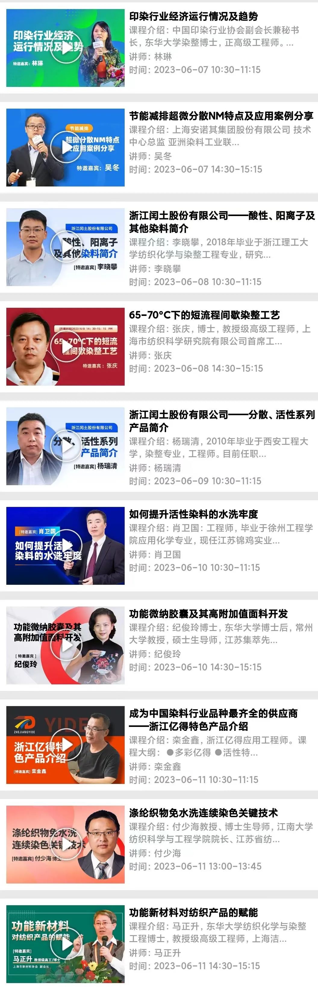 线上展会期间,七彩云电商平台进行了精彩的直播活动,活动内容涵盖了权威行业分析、专家讲座、专题报告等。直播期间,中国印染行业协会副会长兼秘书长林琳博士做了《印染行业经济运行情况及趋势》的权威行业分析;江南大学纺织科学与工程学院院长付少海教授为大家带来了《涤纶织物免水洗连续染色关键技术》的专题讲座;河南工程学院化工与印染工程学院副院长曹机良博士做了《氧化石墨烯在纺织品功能整理中的应用》的主题报告;浙江纺织服装学院染整技术研究所所长、知名助剂专家夏建明教授为大家带来了《从可持续角度,管窥新型纤维与染整新技术》的专题讲座;江南大学纺织科学与工程学院博士生导师王潮霞教授为大家带来《纺织品蓄热技术及应用》的专题课程等。