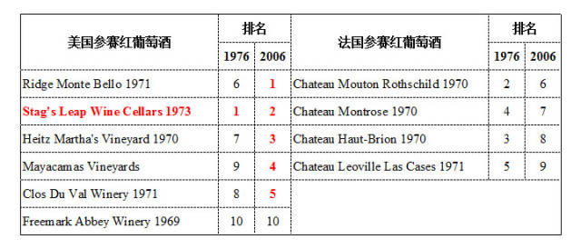 当时人们普遍认为法国葡萄酒是世界上最具享有盛名的葡萄酒,但出乎所有人的意料,来自加利福尼亚的Chateau Montelena 1973和鹿跃酒庄1973年份(Stag’s Leap Wine Cellars 1973)两款葡萄酒战胜了法国葡萄酒,分别获得了白葡萄酒和红葡萄酒的最高分。