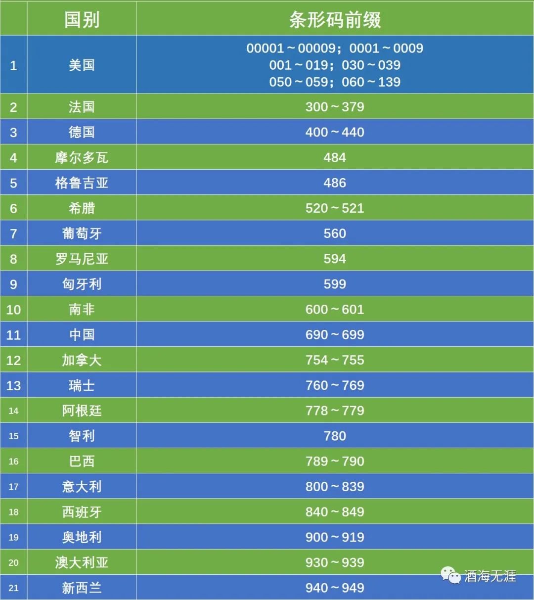 使用最广泛的商品条码EAN-13码,由13位数字构成。前3位前缀是国际条码组织分配给各国的号段——国别代码。具体的国别代码见下表: