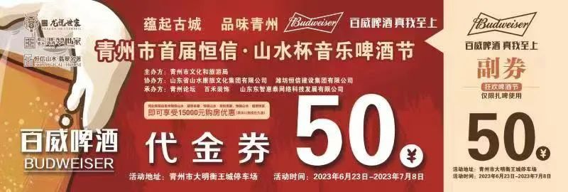 在这热情似火、酒香四溢的美好夜晚,青州市首届恒信·山水杯音乐啤酒节6月23号在大明衡王城盛大开幕,感谢百威啤酒对本次活动的大力支持。同时感谢东方石化加油站提供加油卡,泰和影城提供观影券,东夷游乐园提供畅游卡,状元酥提供精美甜点等。同时,舞台西北角,有桃未了相亲角,大家没对象的可以去看看。舞台的东北角,有青州优质楼盘推荐活动。舞台的正对面除了20多家精美小吃之外,还有孩子玩的游戏,我们啤酒节活动非常丰富,精彩纷呈!
