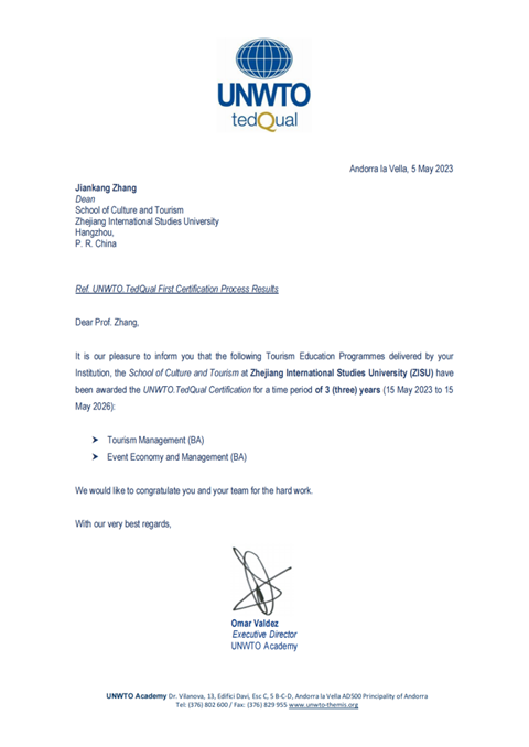 2023年5月,会展经济与管理专业和旅游管理专业共同获联合国世界旅游组织旅游教育质量认证(UNWTO tedQual),此认证为全球旅游教育质量最高标准认证,标志着浙外会展专业国际化办学水平再上新高度。