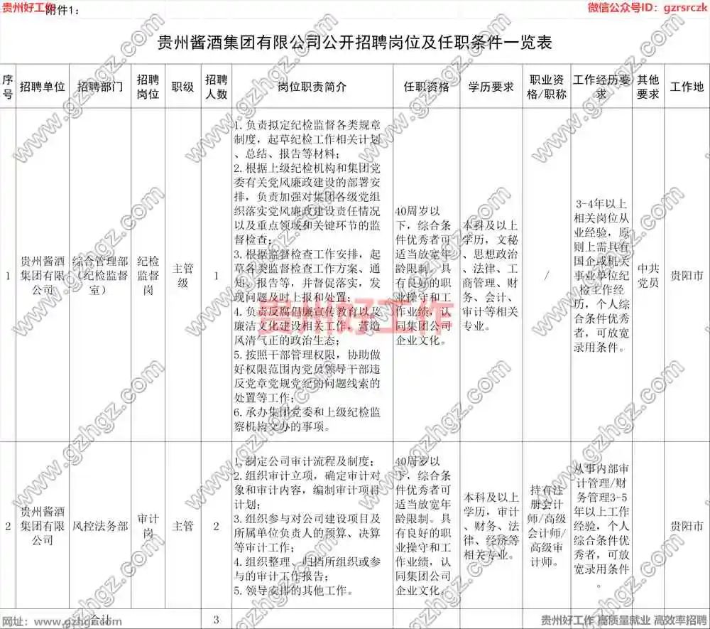 为深入贯彻落实贵州省委、省政府、贵阳市委、市政府做大做强白酒文章、发挥贵州酱香酒产地独特优势的战略决策部署,贵州酱酒集团有限公司(以下简称“贵州酱酒集团”)于2020年12月26日正式注册成立,注册资本为50亿元人民币。贵州酱酒集团将依托产业优势、产品优势和资源优势,实现贵州酱酒在市场价值的转化与增量,持续助力和打造贵州酱酒产业旗舰和知名品牌,力争通过10年的战略布局与稳定发展,夯实业务发展集群,引领品牌影响力,成为贵州酱酒品牌梯队中的标杆企业。 坚持德才兼备的用人标准,按照“公开、平等、竞争、择优”的原则,实行岗位公开、自愿申报、择优聘用的用人机制。 贵州酱酒集团本次面向社会公开招聘3人,具体招聘单位、岗位及要求详见附件《贵州酱酒集团有限公司公开招聘岗位及任职条件一览表 》(见附件1)。任职条件计算年龄、工作年限、任职年限或取得专业技术职称时间计算日截止到本人报名时间。 符合公开招聘岗位设置的学历学位、专业及其他条件的人员,个人综合条件优秀者,可放宽录用条件。 1.具有中华人民共和国国籍,拥护中国共产党领导,热爱祖国;政治素养好,品行优良,廉洁自律,能自觉遵守党纪国法和企业规章制度; 2.大局观念强,忠于企业,能主动维护企业利益,具备良好的职业道德、责任心和较强抗压能力; (1)不能坚持党的基本路线,在重大政治问题上不能与党中央保持一致的,有过反党反社会言行的; (2)有过犯罪记录并受到判刑、处罚、惩戒、行政拘留的; (3)曾被开除公职处分或在机关、企事业单位因违反有关法律、法规、纪律规定被勒令辞退的; (5)曾因贪污、行贿受贿、泄露国家机密等原因受到过党纪政务处分的; (7)在国家和法定机构组织的各级各类招考中被认定实施了考试作弊行为的; (8)近三年年度考核中有被确定为不称职(不合格)的; (10)国家相关法律法规规定不得招聘入职的或其他不宜招聘的情形。 本次招聘人员工作地点为贵阳市,薪酬标准按用人单位薪酬管理办法执行,并执行国家规定的五险一金、法定节假日、带薪年假、定期培训等福利待遇。 招聘工作按照发布招聘公告、报名、资格审查、面试、体检、背景调查、办理入职手续等程序进行。 报名采取网络报名方式,本次报名时间从2023年6月21日至2023年7月4日。根据实际到岗情况,可另行开展招聘工作。 (1)《贵州酱酒集团有限公司职位申请表》(见附件2); 请将上述报名材料扫描后,将文件压缩包发送至用人单位招聘专用邮箱:gzjjjt1@163.com (邮件命名格式为“岗位+姓名+贵州好工作”); 每人仅限应聘一个岗位,请应聘人员核准报名岗位、岗位需求、报名邮箱,避免导致报名信息错发情况。 资料不全或填写不完整者不予考虑,视为放弃招聘资格;通过其他渠道投递、邮箱投递不成功、超过报名时间投递视为无效。 3.留学归国人员需取得教育部留学服务中心出具的国外学历学位认证书。 按照公布的招聘条件对应聘人员进行资格审查。资格审查通过的应聘人员将进入面试环节,面试时间和地点将通过邮件、短信或者电话进行通知。 对提供虚假材料的,伪造、更改有关证件、材料、信息骗取报名资格的,一经查实,立即取消报名资格。 1.初试。资格审查合格进入第一次面试的应聘人员,需提供岗位要求的学历、学位和证书原件。 2.复试。通过初试的人员原则上按照1:3的比例确定参加复试的人员名单,人数不足3人的,按实际人数确定参加复试的人员名单。 背景调查和延伸考察内容主要包括招聘人员政治思想、道德品质、能力素质、学习和工作表现、遵纪守法、廉洁自律等方面。 通过复试的拟录用人员需到三级甲等以上医院进行入职体检,体检项目参照《公务员录用体检通用标准(试行)》、《公务员录用体检操作手册(试行)》等执行。体检结果应为合格,体检费用由应聘人员自理。若应聘人员背景调查和延伸考察不合格、身体条件不能正常履行招聘岗位职责的,将取消录用资格,根据评分排名情况择优递补。 经上述环节确定为聘用对象的应聘人员,将与用人单位签订劳动合同。聘用人员应在规定时间内到用人单位报到。 如在录用之后查出招聘时报名人员提供虚假材料或伪造、更改有关证件、材料、信息骗取应聘资格的,一经查实,取消录用资格。 (一)在招聘过程中,应聘人员未阅读或误读信息,联系电话无法有效接通等自身原因造成无法参加招聘的,后果由应聘人员自行承担。 (二)本《招聘简章》未尽事宜由贵州酱酒集团招聘工作领导小组研究决定。 (三)本《招聘简章》由贵州酱酒集团招聘工作领导小组负责解释。 附件:1.贵州酱酒集团有限公司公开招聘岗位及任职条件一览表 2.贵州酱酒集团有限公司职位申请表.doc (59.50 KB)