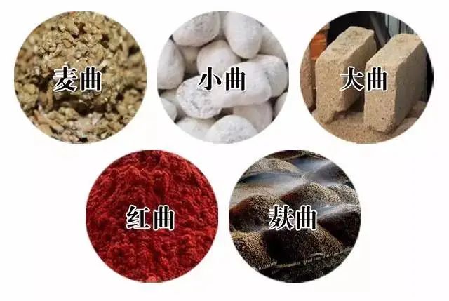 酒曲主要分为五类,分别是红曲、麦曲、麸曲、大曲、小曲,由于制曲原料的不同,它们被用于酿造不同种类的白酒。如小曲,以大米为原料,主要用于酿造黄酒和小曲酒,多采用半固态发酵,南方白酒多为小曲酒;大曲,原料主要是大麦、小麦和豌豆,一般是固态发酵。大曲酒的质量好,很多名酒厂都用大曲来进行酿造。