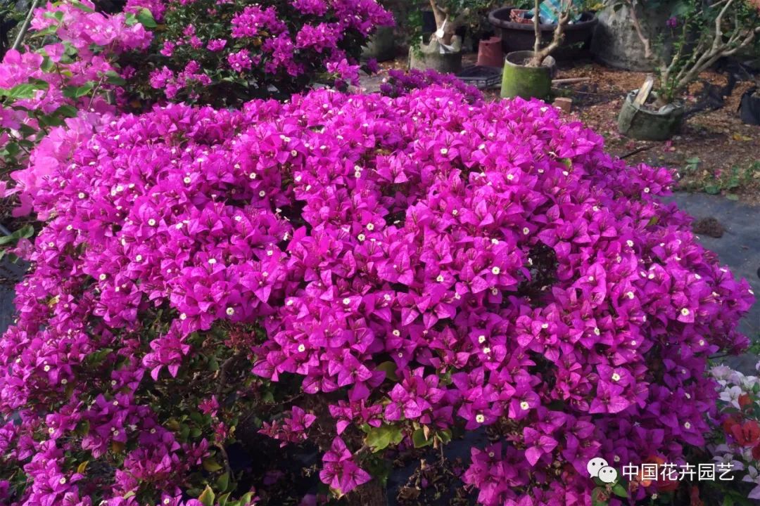 ▲‘赑屃’是2013年从‘小叶紫’天然结实的实生株选育而成。该品种有矮小、分枝多、匍匐生长;花开繁密,终年不断,苞片深紫;叶小而密、深绿且具光泽;茎部枝条刚硬、节间短、徒长枝少等优点。