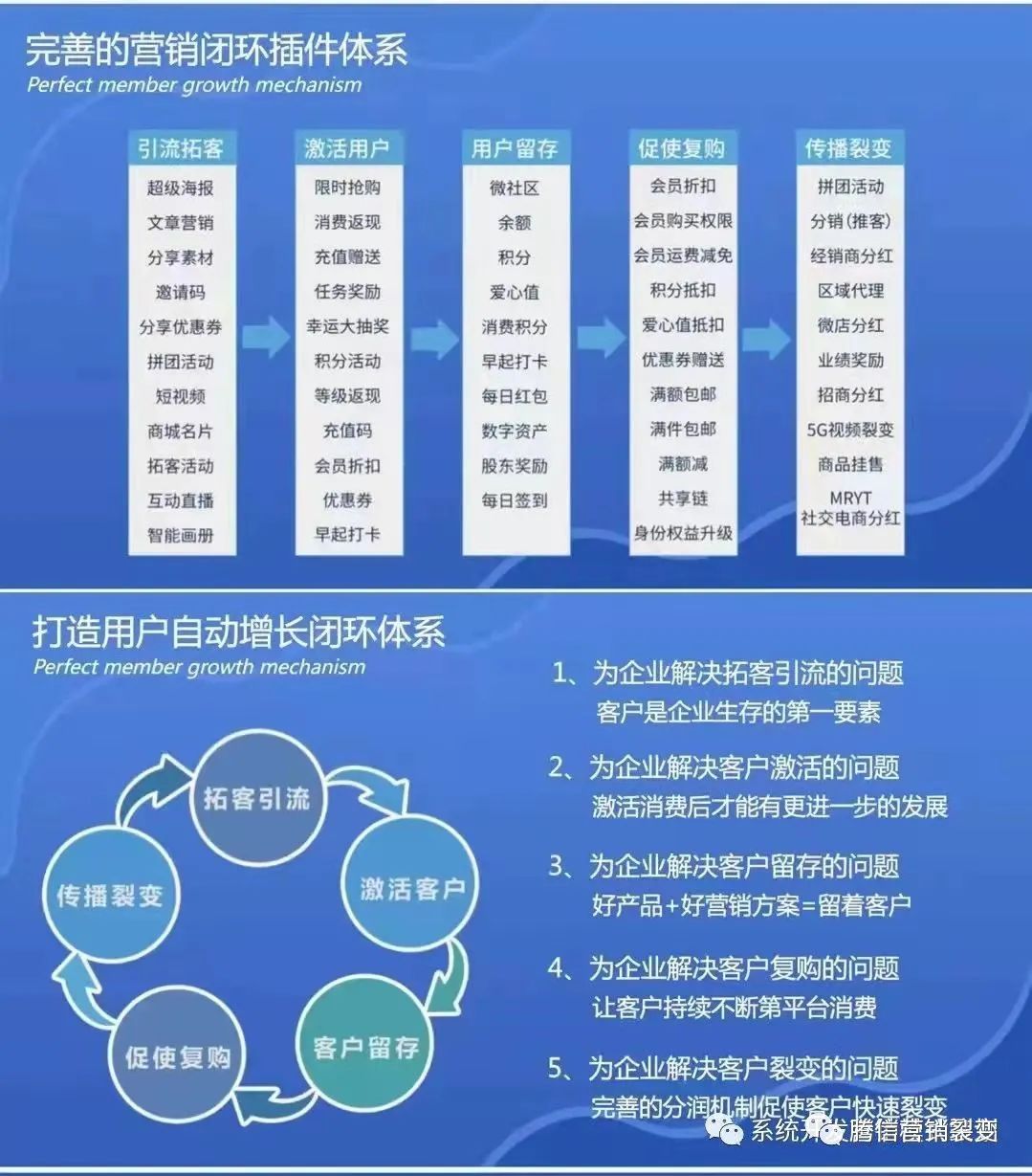 商城下单、分润模式实现(价差、分销、区域分红、团队业绩分红等...)、门店导航、自动返佣、素材推广,营销功能,等....