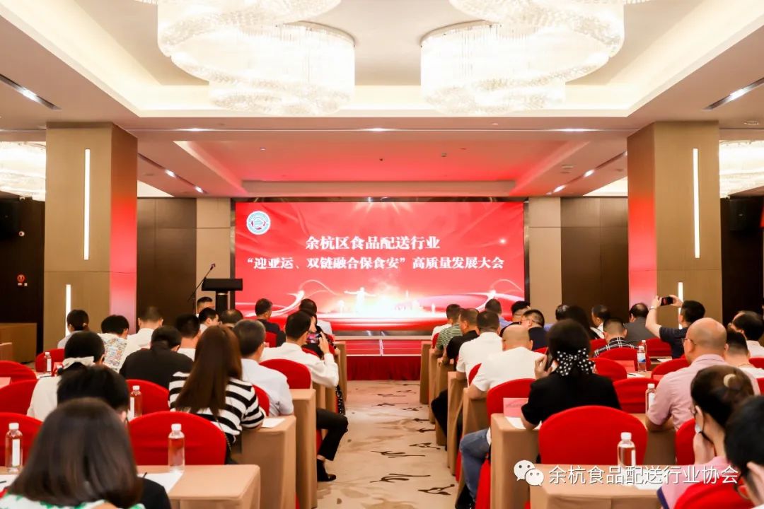 亚运的火炬已从良渚点燃,新经济体的重塑将从良渚出发。值此杭州亚运盛会来临之际,为保障食品供应链安全,促进以食品配送为主营业务的新经济体高质量发展,6月21日下午,在余杭区市场监督管理局的指导下,余杭区食品配送行业“迎亚运、双链融合保食安”高质量发展大会暨杭州市余杭区食品配送行业协会年度工作会议在良渚享·淇遇酒店顺利召开。杭州市交警支队、余杭区市场监督管理局、余杭区商务局、余杭区农业农村局、余杭区教育局、余杭区民政局、余杭区机关事务局、良渚街道办事处、余杭区食品药品监测中心、中共余杭区小个专综合党委等各级职能部门、事业单位、党建指导机关领导,杭州市农贸市场行业协会、余杭区个民协会、余杭区餐饮行业协会、余杭区食品工业与流通行业协会、中国工商银行、余杭农商行、浙商银行、物流中心十大市场、会员单位等共130余人参加了本次会议。