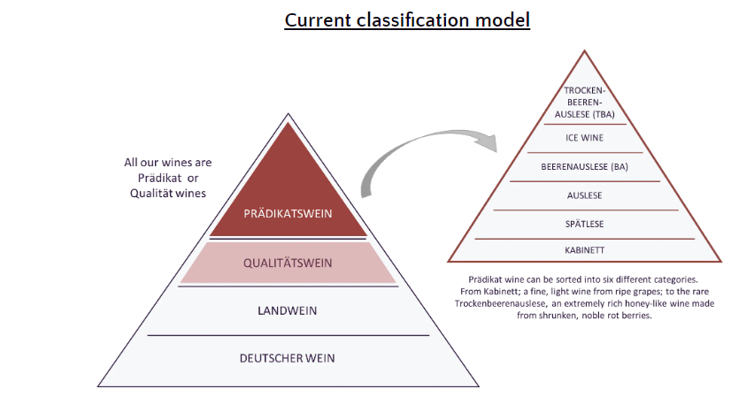 Kabinett :中文一般翻译为”珍藏“或”小房“酒。采收时葡萄中糖含量在67-82oechsle,酿造的葡萄酒一般为干型或半干(甜)型(可根据酒精含量判断,酒精度若低于10°。最少是半干型); Spätlese :晚收。采收时葡萄糖中含量在76-96oechsle,酿成的酒比Kabinett甜,风味也更为丰富; Auslese:精选。采收时葡萄中糖含量在83-100oechsle,且部分葡萄可能已受到贵腐菌感染。酿造的为甜型酒。 Beerenauslese (BA):贵腐精选。采收时葡萄中糖含量在110-128oechsle,且葡萄都已受到贵腐菌的感染。酿造的酒很甜。 Trockenbeerenauslese (TBA):干粒贵腐精选。采收时葡萄中糖含量在150-154oechsle,葡萄除已受到贵腐菌感染之外,还需要干燥到一定程度。酿成的酒非常非常甜,产量极低。 Eiswein(ice wine):冰酒。在零下7度下采收压榨葡萄,采收时葡萄中糖含量在110-128oechsle. 酿成的酒也很甜。