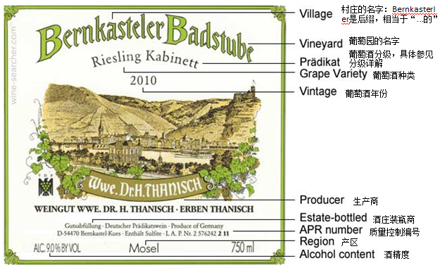 德国酒标相对来说较为复杂,但提供的信息也相对很丰富。 通过酒标,我们可以得知以下信息:制造商名称及地址、葡萄酒的甜度、葡萄品种、采收时葡萄的成熟度、葡萄园所在村庄的名字、这瓶酒是酒庄装瓶还是第三方装瓶。