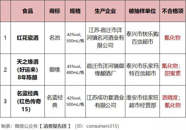 江苏宿迁市洋河镇名河酒业有限公司生产的红花瓷酒等3款白酒,均检出“氰化物”项目不合格。
