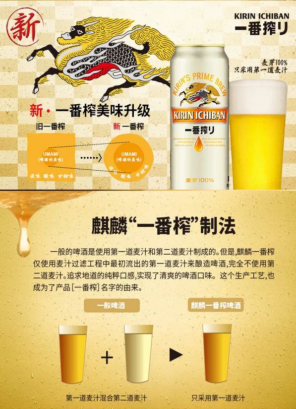 麒麟作为日本工业啤酒巨头之一,从创始开始就始终秉承的酿造工业 ,为了保留啤酒的原汁原味,他们只提取第一道麦汁酿造, 真正的100%麦芽酿造 ,口感更纯净 ,清爽!一番榨的名字 ,也由此而来!