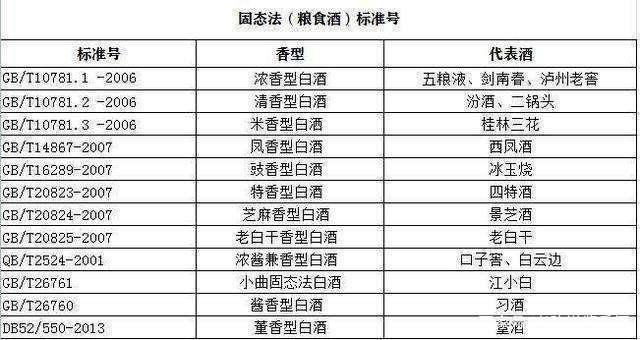 GB/ 液态法白酒GB/固液法白酒GB/ 酱香型白酒 (茅台酒,郎酒等)GB/.1浓香型白酒 (五粮液,泸州老窖,剑南春等)GB/.2 清香型白酒 (宝丰酒,汾酒等)GB/.3 米香型白酒GB/ 凤香型白酒 (西凤酒等)GB/ 豉香型白酒GB/ 特香型白酒 (四特酒等)GB/ 芝麻香型白酒GB/ 老白干香型白酒 (衡水老白干等)GB/ 浓酱兼香型白酒 (白云边等)GB/ 小曲固态法白酒。