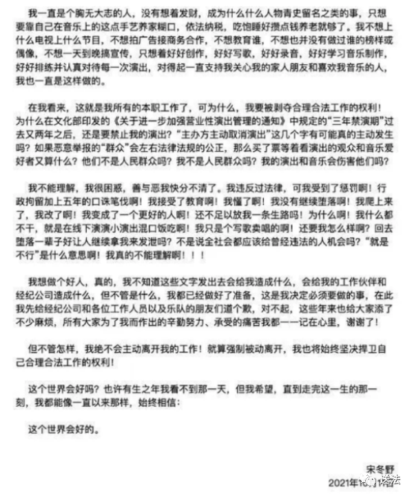 宋冬野因演出被取消,发长文“叫冤”,声称“我是受害者,而不是加害者!”