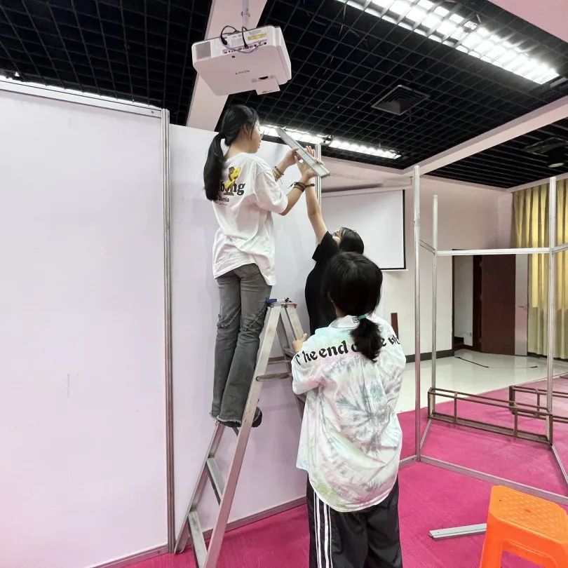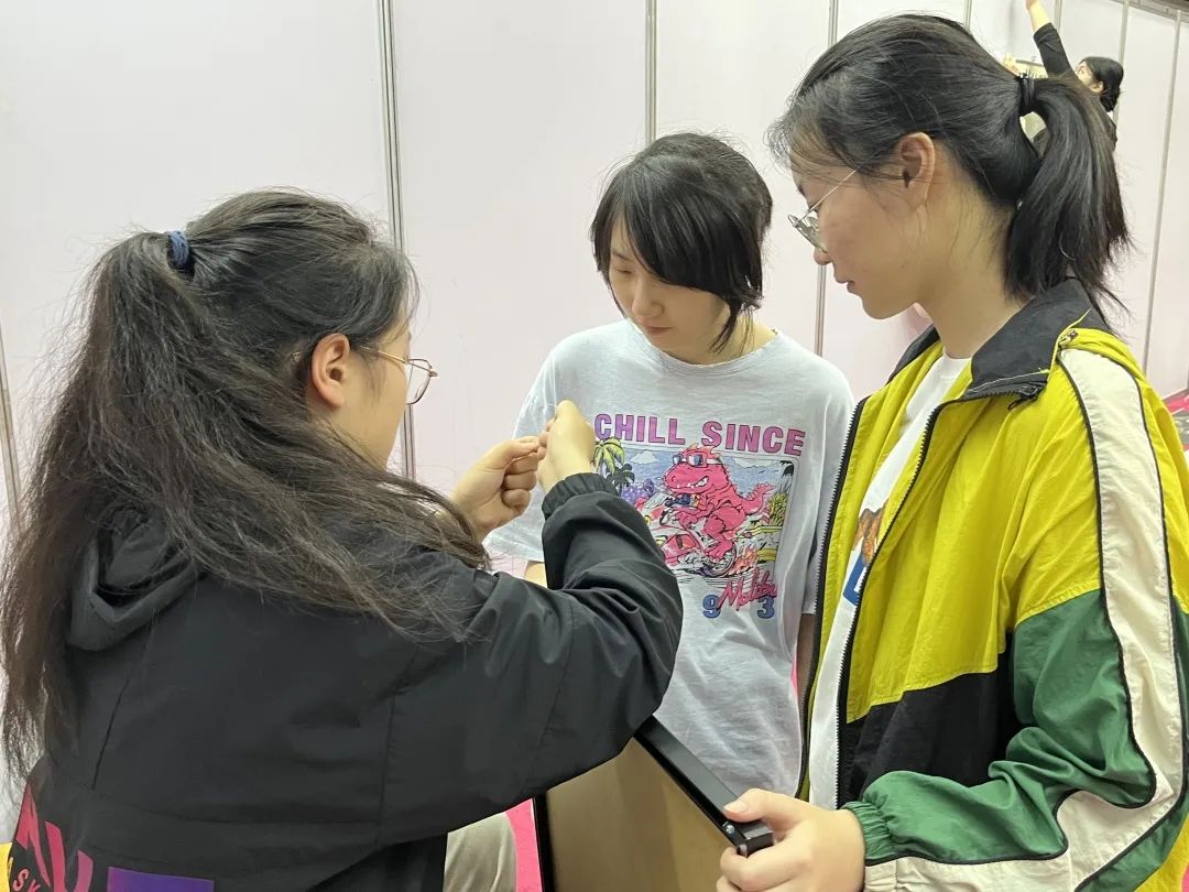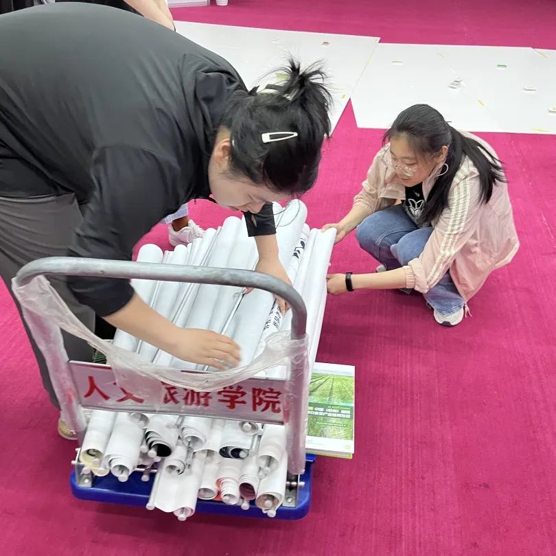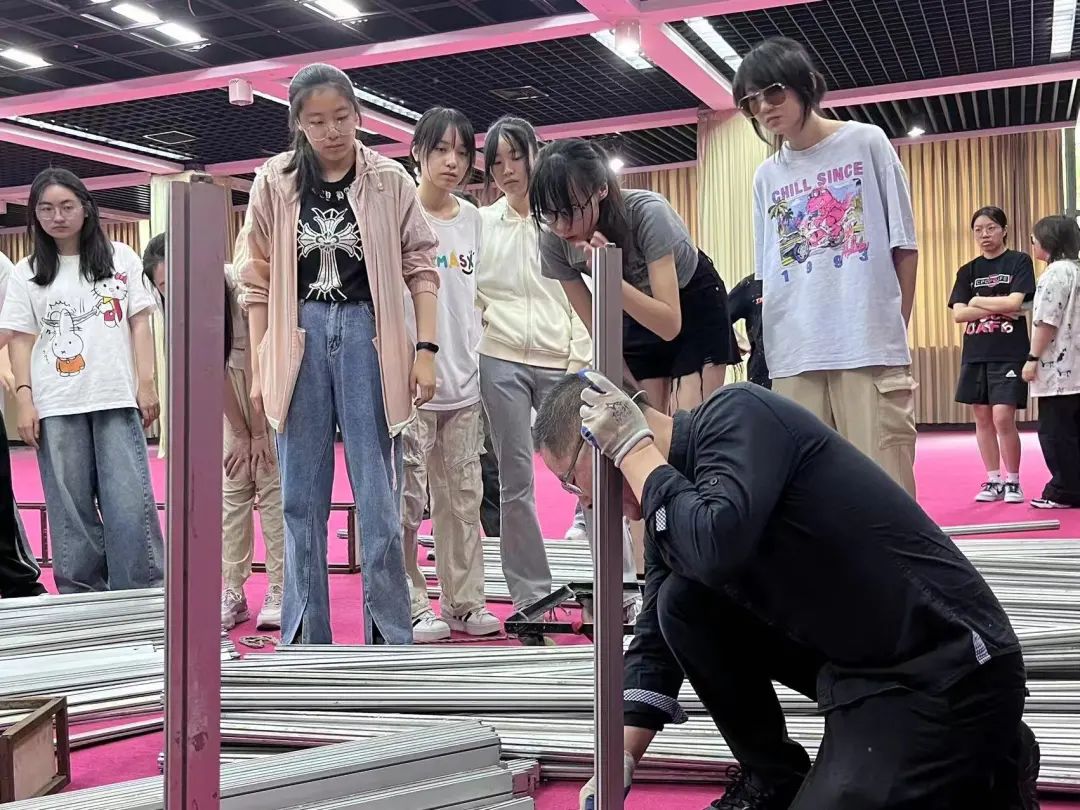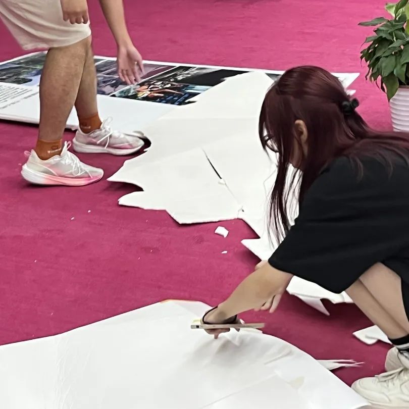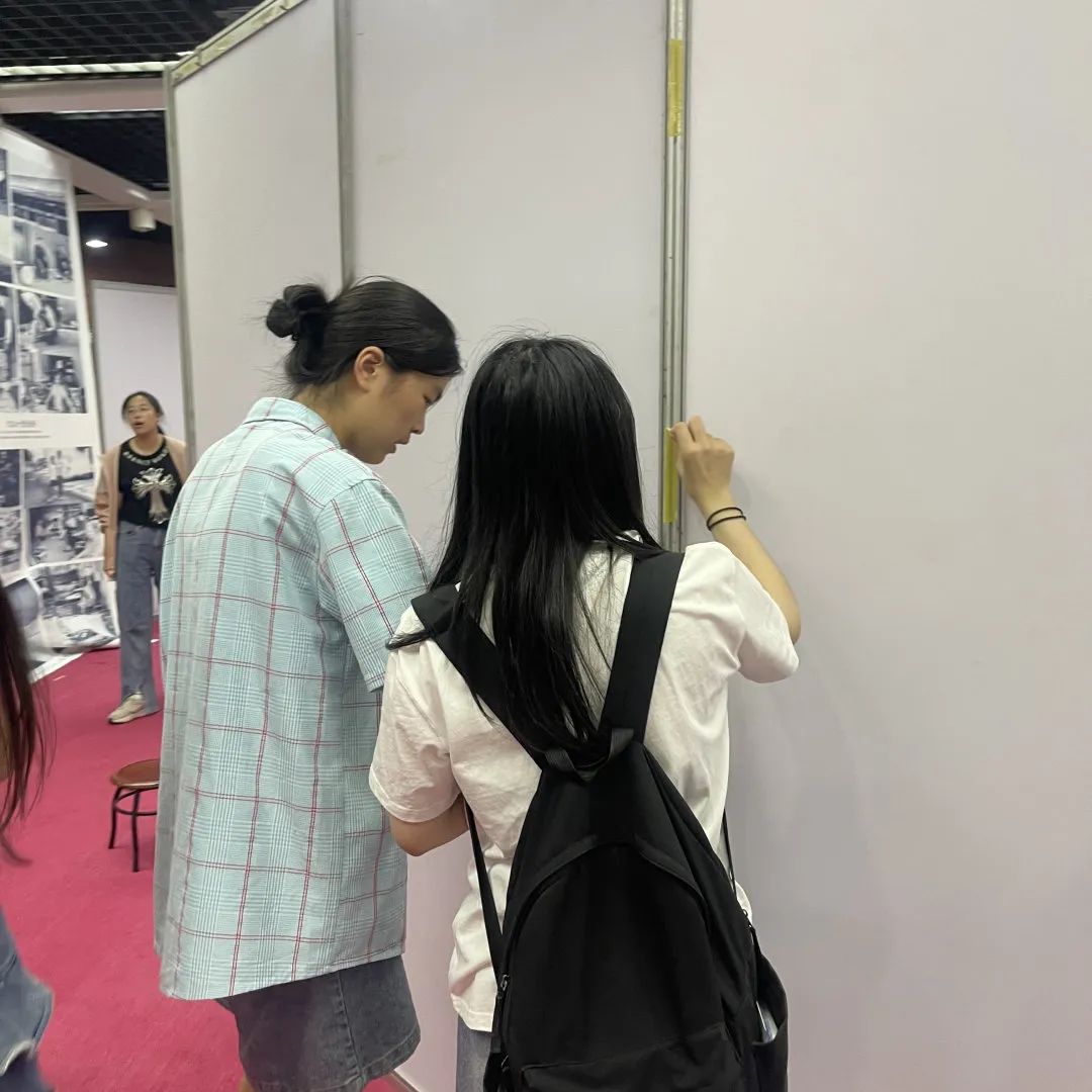 这一天,会展224班的同学们都忙碌在搭建布展的第一线。搭建工作对大家来说是新的挑战,同学们在搭建公司指导老师的带领下,学习如何组装、拼板、固定,在老师的指导和大家的共同努力下,顺利完成搭建工作。在布展环节中,同学们一遍遍地向老师确认各种细节,只为了能够让展会能够呈现出最好的效果,带给观众以最佳的视觉感受。