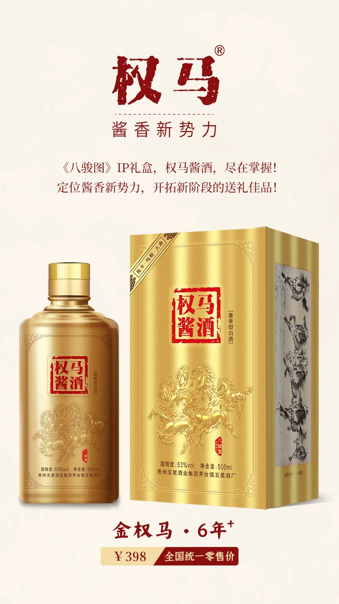 权马酱酒,尽在掌握。《八骏图》IP具有高度的国民认同感,自带流量,权马以马的创新开拓,定位酱香新势力,给予人们顽强拼搏,奔腾不息的动力,作为阶段性成果的庆功酒最适宜。